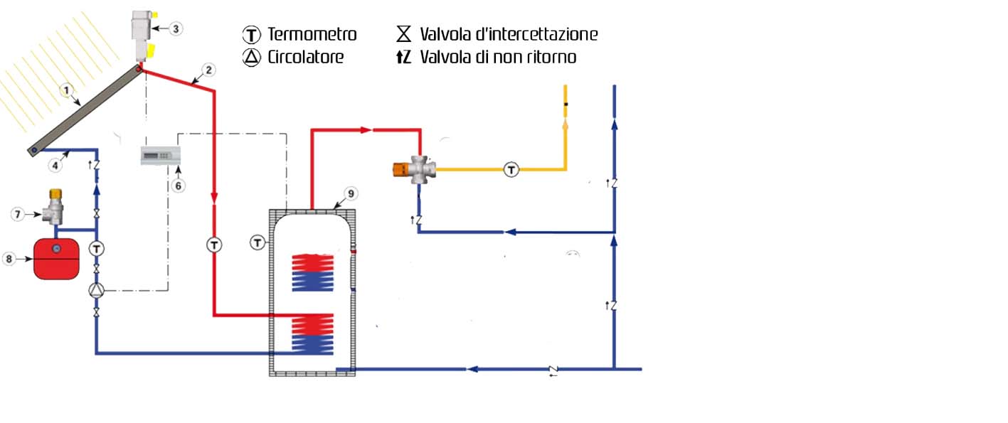 -In estate il sole spinge forte e rischio di trovarmi con temperature elevate nel bollitore solare, di conseguenza la pompa del TC non parte fino a che il TC stesso non supera la temperatura a quella altezza/posizione.