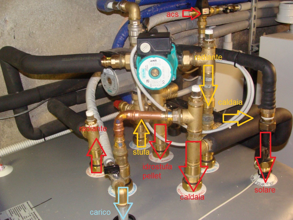 io prima installare l'impianto non ne sapevo nulla e mi sono fidato ciecamente dell'idraulico, il quale mi ha collegato la caldaia (Junkers Zsb 28-3 A 23) in carico al rotex 500 insieme alla idrostufa a pellet ed ovviamente a 2 pannelli (vedi allegato).