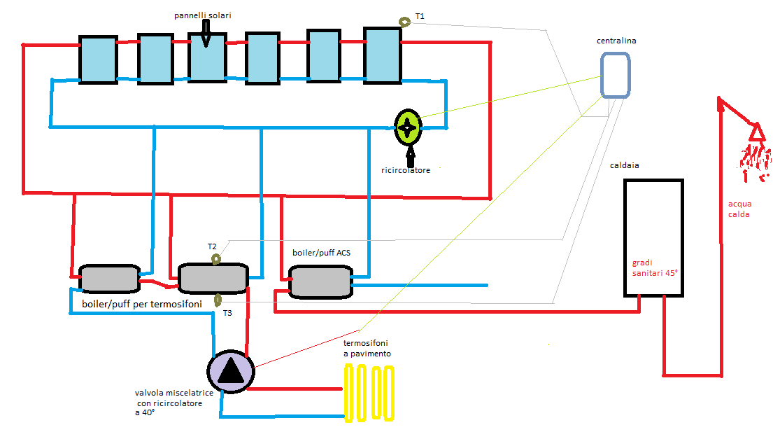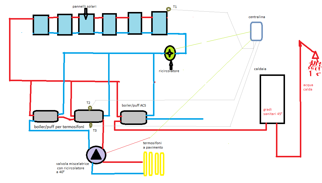 1- avendo un circolatore con valvola miscelatrice, impostato a 40° è giusto che si attivi tramite relè quando: la centralina del solare termico attiva il circolatore dei pannelli ed ovviamente attivato da uno dei termostati? Questo avviene nel momento in cui c'è una differenza di 5° tra il T1(pannelli) ed il T2 (parte bassa dei boiler).